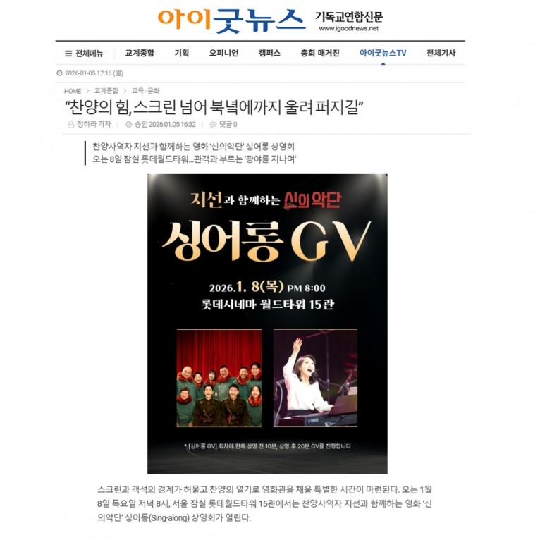 [기사] “찬양의 힘, 스크린 넘어 북녘에까지 울려 퍼지길”(아이굿뉴스 기독교연합신문)