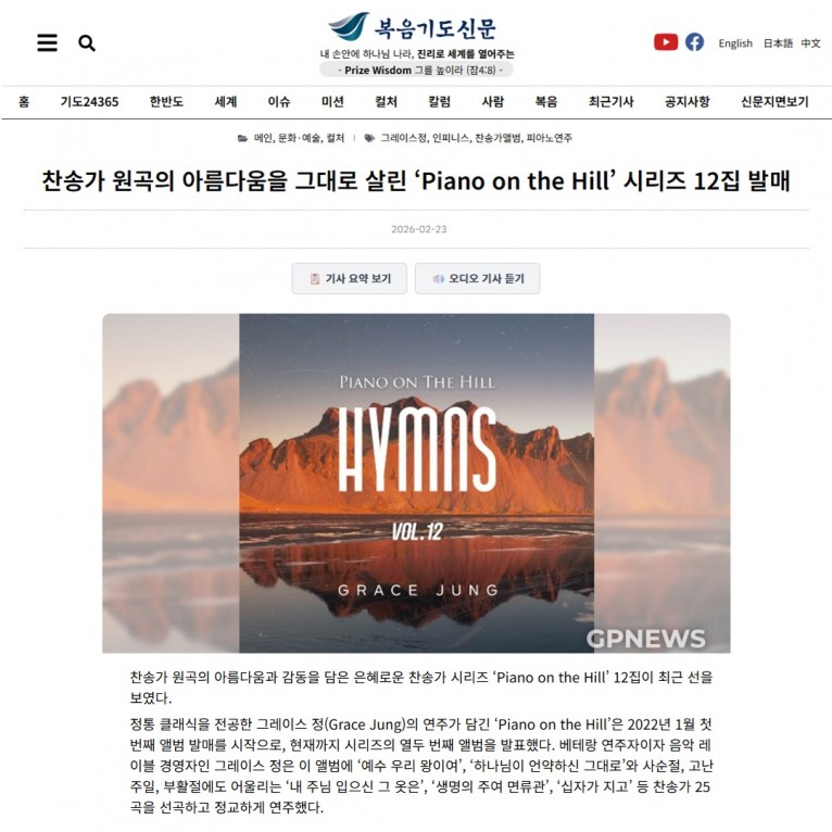 [기사] 찬송가 원곡의 아름다움을 그대로 살린 ‘Piano on the Hill’ 시리즈 12집 발매(복음기도신문)